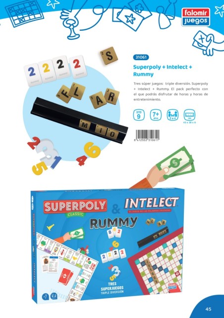 31061 30000 Superpoly + Intelect + Rummy Tres súper juegos: triple diversión. Superpoly + Intelect + Rummy. El pack perfecto con el que podrás disfrutar de horas y horas de entretenimiento. STD 7 + 9 años 2 a 4 cm 43 x 30 x 6 8ELCPPD*d ag + 45