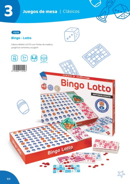 3 Juegos de mesa | Clásicos 11519 Bingo - Lotto Clásico BINGO LOTTO con fichas de madera, ¡¡coge tus cartones y a jugar!! STD 7 + 10 años +2 cm 39 x 27 x 5 60
